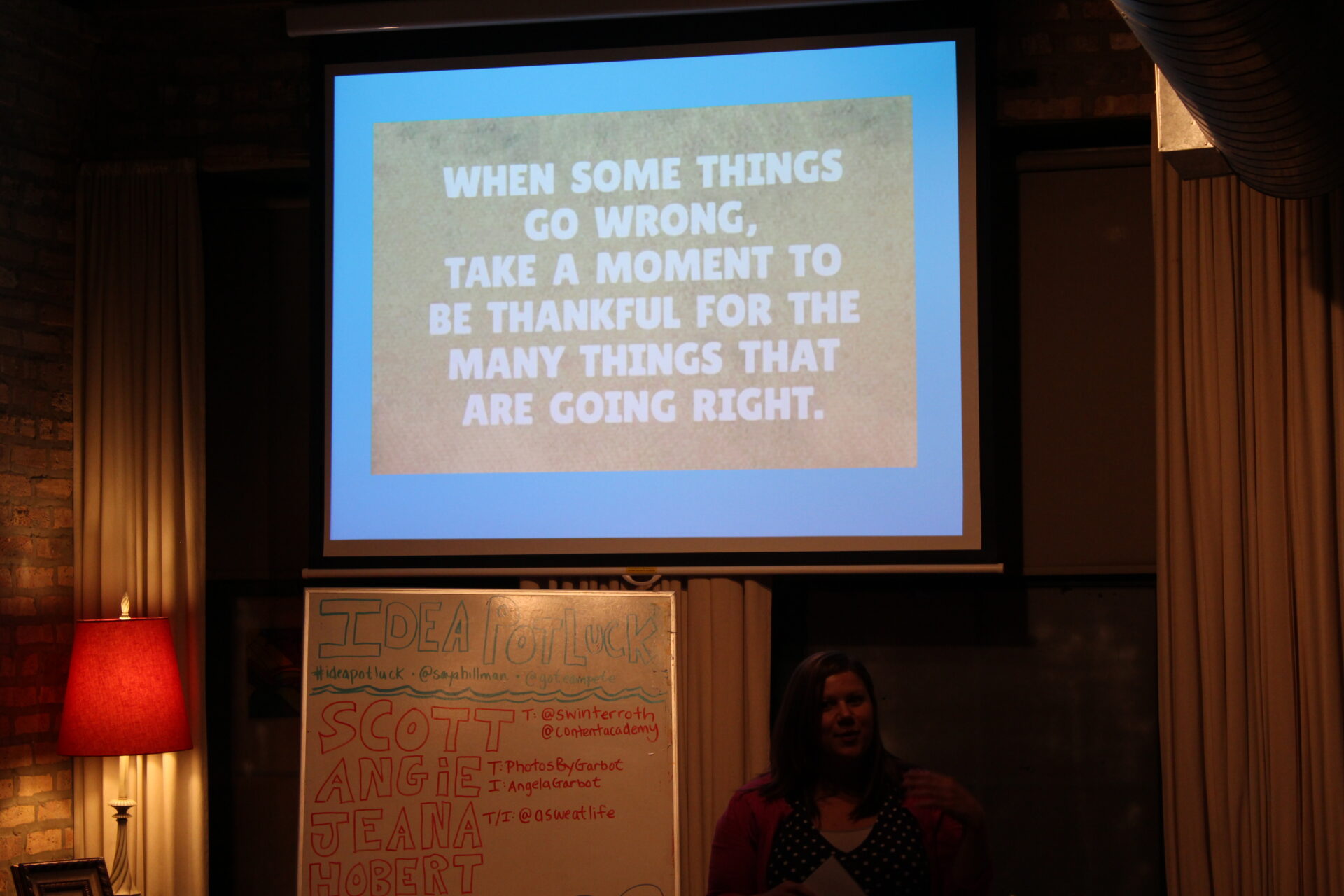 Idea Potluck is a potluck of ideas rather than food, where the Dishes are the presenters.