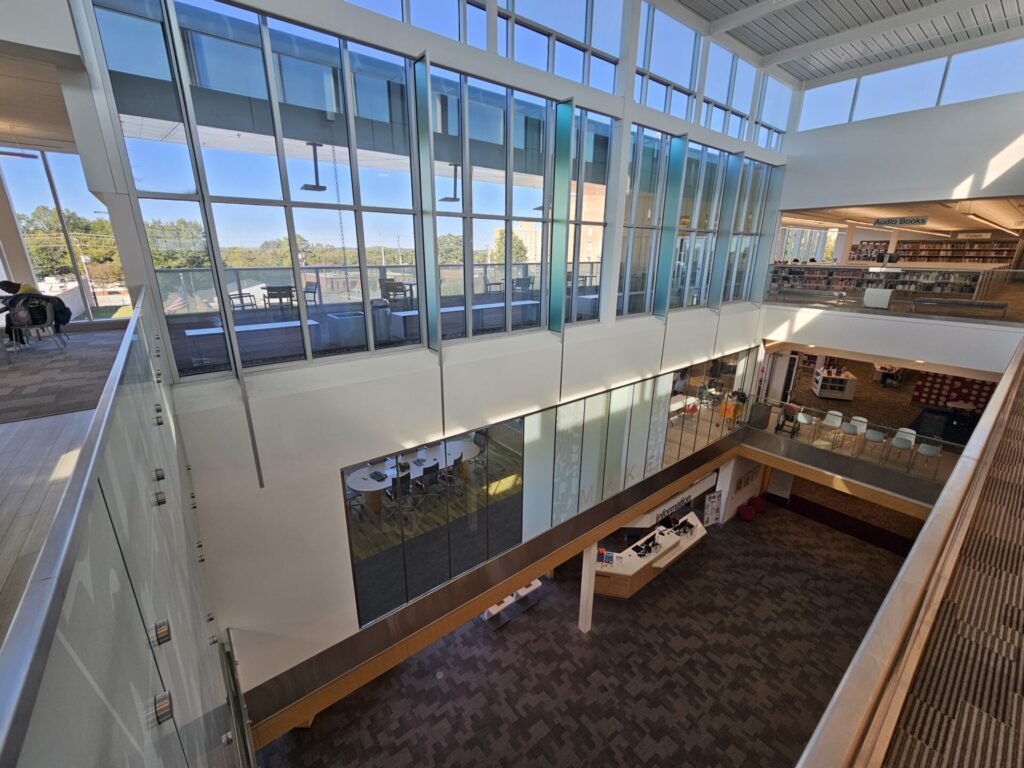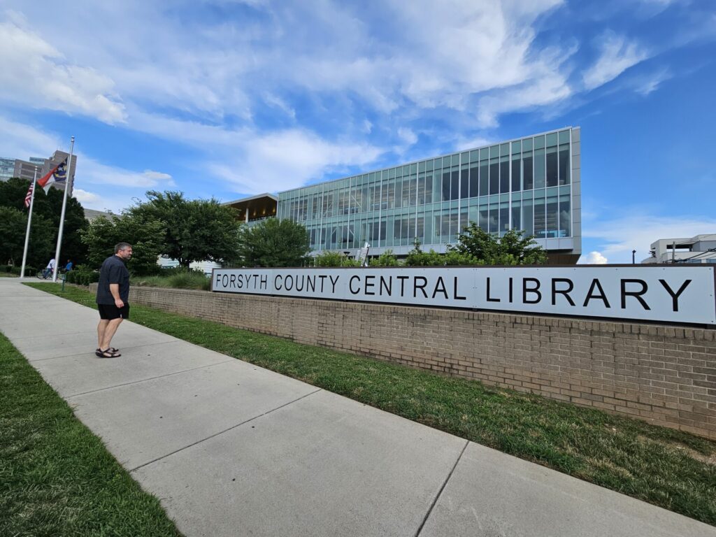 Chicago has 81 libraries. I hardly used them. Here? (10 libraries) I’ve become a Library Girlie. From checking out my book club books to checking out my first audiobook via the fabulous Libby app. To attending an event in its massive meeting space (Forsyth County Democratic Women) to attending an event in its intimate meeting space (writing group). I haven’t yet used its makerspace, sound production studio, or small business center, or checked out the Birding Backpack (everything you need to go birding, in a backpack! I mean…). I’m too vintage to hang out in the cool “Why didn’t I have this growing up?!” teen center. I wandered the 3rd floor artist exhibit, cooing at painting after painting, followed by a “What the what?!” wandering into the open-air seating area. When we first visited, Central Library’s mere esthetics gave us, “Ohhhhhh! This is niiiiiice!,” let alone all of its offerings.