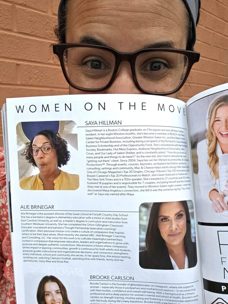 Mac & Cheese is plugging along. I’m still running my cleaning business in Chicago. Still consulting and coaching virtually with clients, local and elsewhere. Still running courses and selling products. Still speaking and facilitating, local and elsewhere. Still hosting virtual and in-person goodness. In Winston, I’ve had two Blueprint Board workshops, a Workplace Improv workshop, two Idea Potlucks, and a speed-friending, and the upcoming calendar includes another speed-friending, two Comfy Clubs, and monthly Idea Potlucks through the end of the year. Not to mention wheels turning on TBD goodness. It’s been twenty-two years of self-employed, work from home, say yes and figure it out as I go bliss, and thankfully, a new zip code does not equal a new MO—appears I can continue to do things I enjoy and that I’m good at, and that people will pay me for said things because said things are good for them and will spread the Mac & Cheese word because they deem said things things their people would want to know about. Win-win-win. Life of Yes℠. Check out the oh so sweet reviews folks have left.