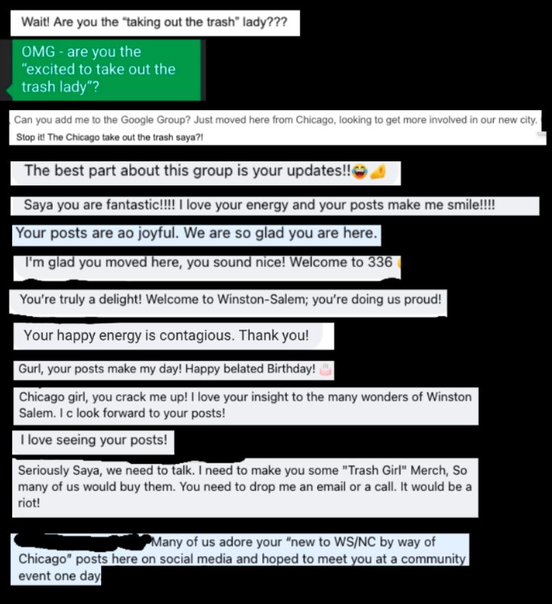 As evidenced by the fact that I’m most known as Mac & Cheese or Trash Girl here—it’s ridiculous off the charts how many times I’ve been called these, usually shared in a real-time realization tone of “Wait, you’re Mac & Cheese?! You’re Trash Girl?!”—trash has been a big part of our transition. It started pre-move when I realized that I’d have to take the trash out for the time in my life. In Evanston, Boston, Chicago, you take your inside trash outside to the trash bins and that’s where your trash journey ends. The city comes by and empties the bin into their truck. Yes, it’s on a certain day of the week but we don’t really pay attention to that. No need. There’s no moving of the bins on your part. As opposed to in Winston, when I shared my genuine excitement about taking out the trash here in a Winston-Salem Facebook group, I was met with gazillions of tips, no no’s, and stories. Links to the Winston-Salem Collects app, now a shortcut on my phone screen. A neighbor printing out a copy of the trash schedule. Because here, “taking out the trash” means taking your inside trash outside to the trash bins and then, depending on the day of the week, and depending on the week, you roll your bin, bins x2, bins x3 to the curb. Maybe it’s just trash day. Maybe it’s trash + recycling day. Maybe it’s trash + recycling + yard waste day. But don’t try to get one past the city and put out your Yard Waste cart if it doesn’t have current sticker on it (it’s like Chicago’s city sticker on your car; you have to renew it every year); we didn’t realize we didn’t have an uptodate sticker or that that was a thing, and put out our green bin. End of day, we wheeled the still full bin back up the driveway, scratching our heads and wondering why the city didn’t like us. I’ve thought and talked about trash more in the last eight months than in the previous forty-six years of my life. I get a reminder notification every Tuesday 8pm to roll out the bin(s). What is my life?!